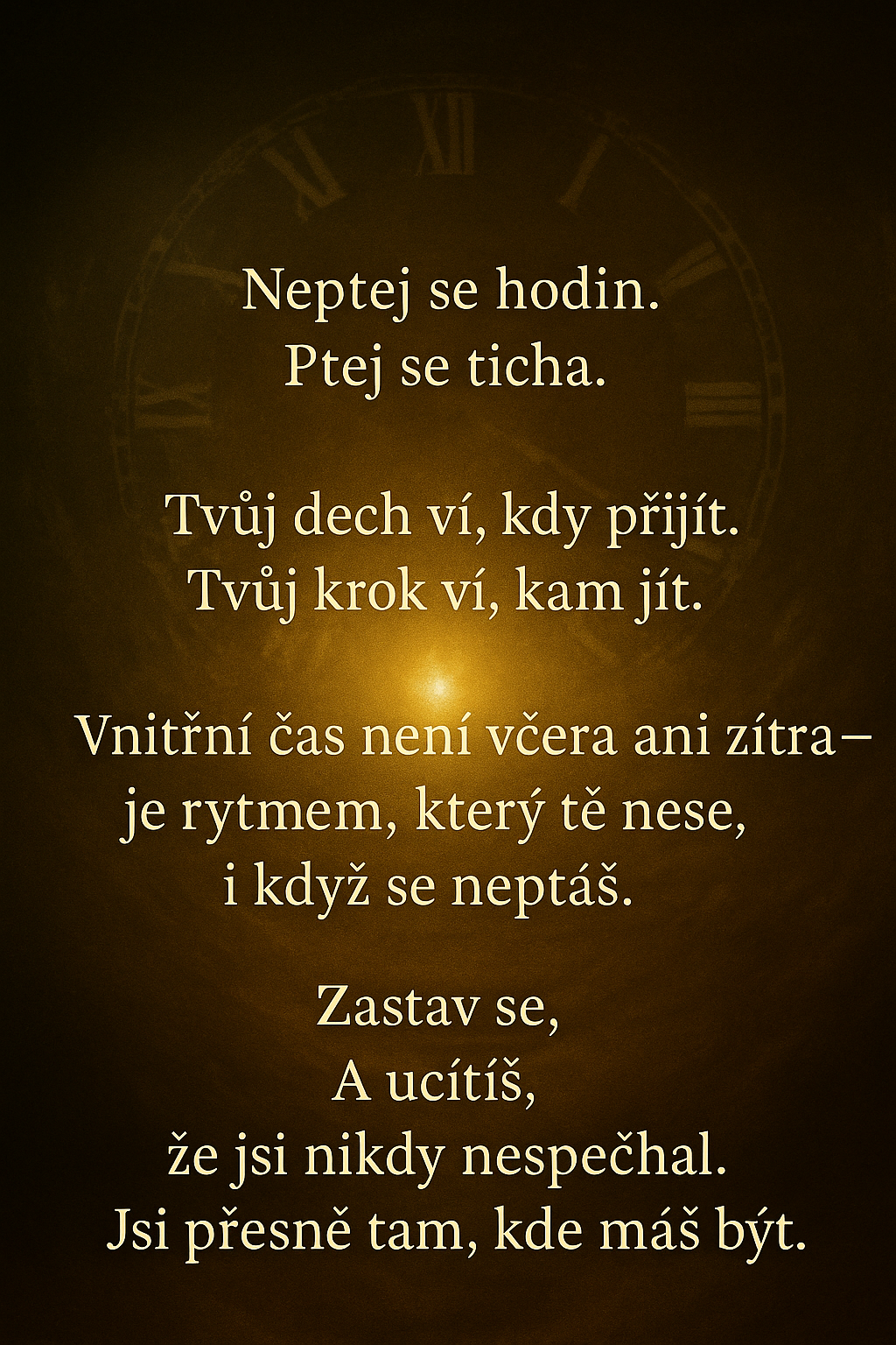 Vnitřní čas se nezměřil, ale rozpoznal. Není to proud minut, ale dech vědomí, které se v tichu sladí se vším, co je. Když přestaneš spěchat, začneš slyšet rytmus, který tě odjakživa vede — ne vpřed, ale dovnitř. Je to světlo mezi okamžiky, prostor mezi myšlenkami, dech mezi údery srdce. A právě tam, v tom neviditelném místě, se čas stává bytím, které dýchá tebou.