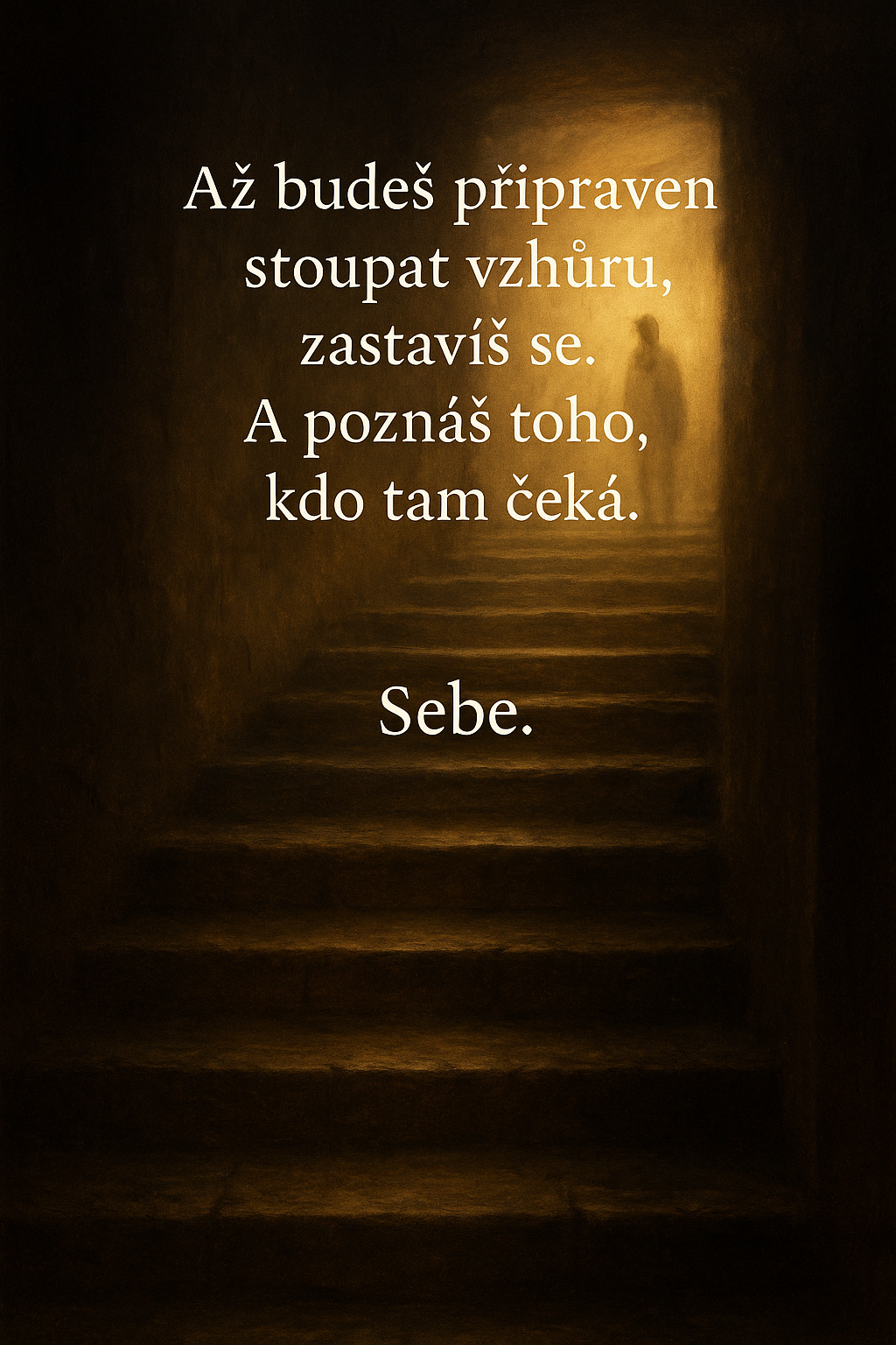 Není to výzva k výkonu, ale k dovolení být — dorůst, dojít, a být přijat tím, kým už jsem. Čekající bytost na vrcholu není jiný, není cizí, není autorita. Je to klidná přítomnost, která nehodnotí, jen čeká v lásce.