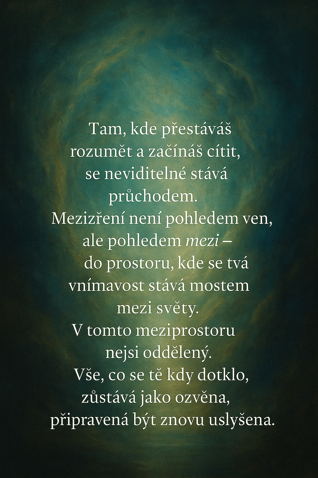 "Tam, kde přestáváš rozumět a začínáš cítit, se neviditelné stává průchodem. Mezizření není pohledem ven, ale pohledem mezi — do prostoru, kde se tvá vnímavost stává mostem mezi světy. V tomto meziprostoru nejsi oddělený. Vše, co se tě kdy dotklo, zůstává jako ozvěna, připravená být znovu uslyšena."