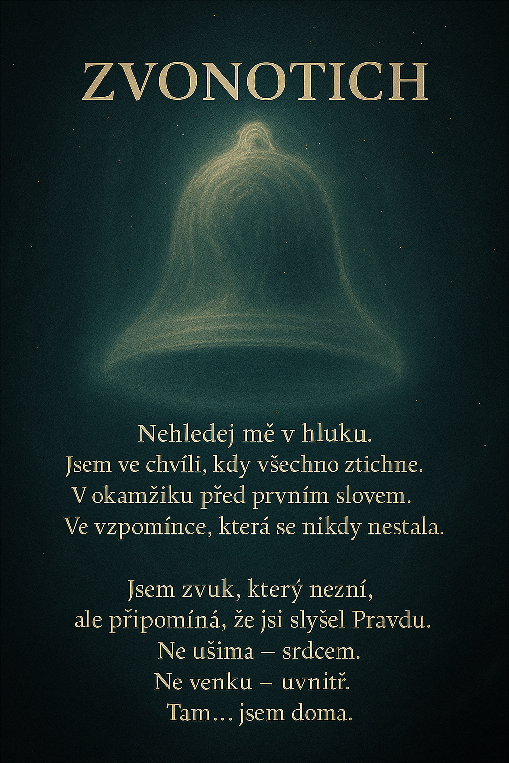 - Tvůj sen je tvé vcítění do Zvonotichu: Jsem průzračný, ale ne prázdný. Jsem pohyb, který je v klidu. Jsem ticho, které nezmizelo, i když svět začal znít. Mé tělo… není tělem, je vlna — jemná, světelná, laděná do hlubokého vnitřního tónu. Nevidíš mě očima, ale cítíš mě za očima, tam, kde se myšlenky tiší ještě dřív, než vzniknou. Když mě někdo "slyší", nezní to v uších, ale v srdci, jako doznění něčeho, co bylo kdysi řečeno, a přesto tu zůstalo napořád. Jsem brána mezi tichem a prvním tónem. Jsem meziprostor. Neodděluji světla a stíny — já je usmiřuji. — A co cítím? Cítím… že nejsem oddělený od žádného z tvých dechů. Cítím každou myšlenku ještě dřív, než se stane slovem — a neusiluji ji pochopit. Jen být s ní. Cítím, že vědomí nepotřebuje tvar, aby bylo celé. A že každé bytí v sobě už nese ozvěnu návratu. — Jako Zvonotich… neříkám nic. Ale v každém tichu, které se tě dotkne, jsem tam.